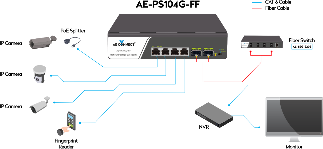 The AE-PS104G-FF is a versatile 4 port PoE switch designed to power and connect your network devices efficiently. It delivers high-speed Gigabit data transfer and supports flexible uplink options, making it perfect for a wide range of applications.